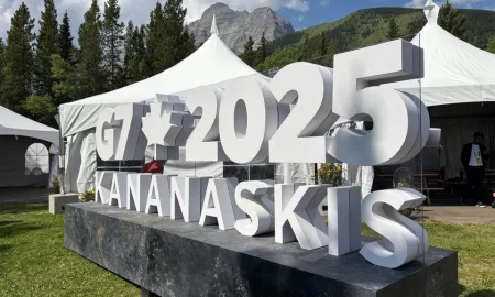 La presidenta Claudia Sheinbaum Pardo arribó a la sede de la Cumbre del Grupo de los Siete, en cuya plenaria, en calidad...