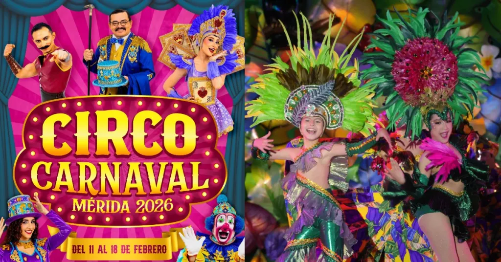 El Carnaval de Mérida 2026 se celebrará del 11 al 18 de febrero, bajo el lema “El Circo Carnaval Mérida“, ofreciendo magia, fantasía y espectáculos en Ciudad Carnaval en Xmatkuil.