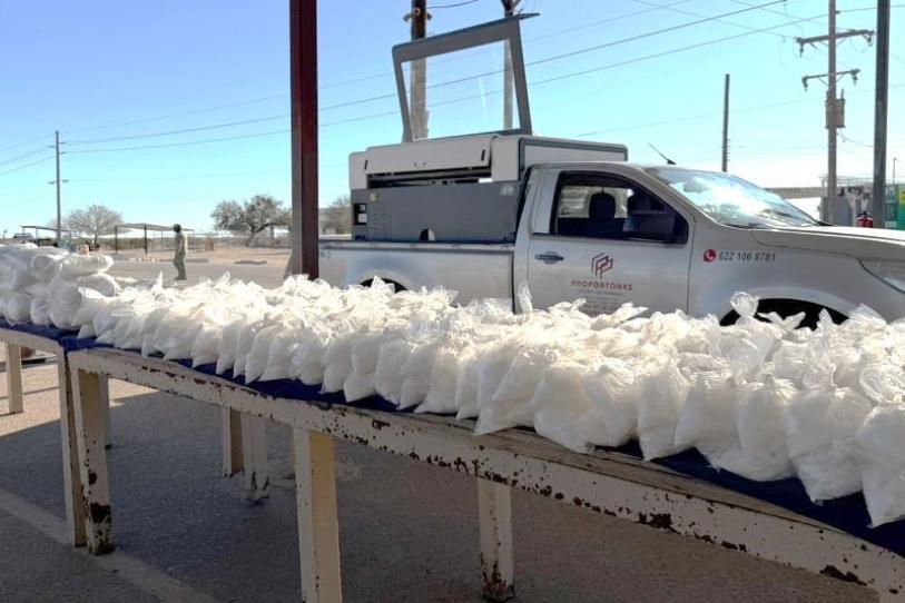 Al revisar manualmente la unidad, las autoridades localizaron un cargamento oculto compuesto por más de 212 kilogramos de metanfetamina, distribuidos en paquetes de aproximadamente 450 gramos, así como un kilogramo de fentanilo y cerca de 15 kilogramos de mariguana. La droga fue asegurada de inmediato junto con el vehículo, como parte de los protocolos establecidos.